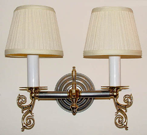 Another 'Country English' Colonial wall sconce in mixed metals. A straight arm works well here with the curled polished cast brass arm backs. Shown here with egg shell mushroom pleat fabric shade. Custom widths are no problem! Looks great in other metals like antique brass!