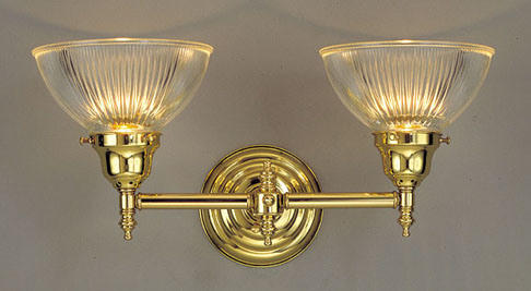 This two light Art Deco style wall sconce has its width set as custom as you'd like it. Holophane style 'Bowl Shades' with their prismatic grooves really completes the Deco period here.