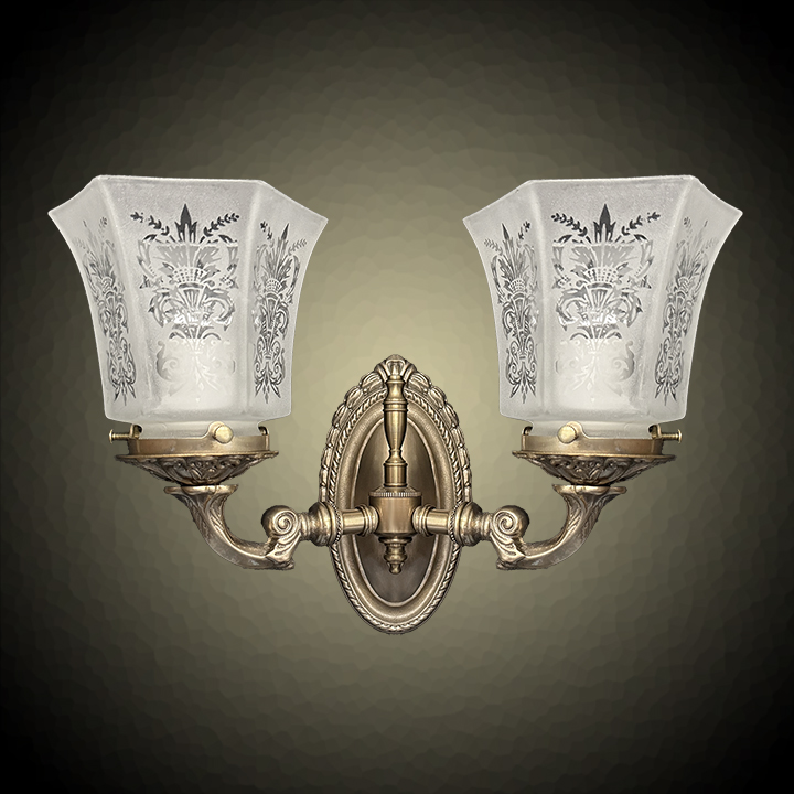 An interesting vintage gas light design, this two light wall sconce offers plenty of light and a lovely feel. Solid cast brass construction hexagonal French acid etched glass globe. An added cast brass bobeche (plate) under each of the glass shade holders adds depth. Mount it up or mount it down.